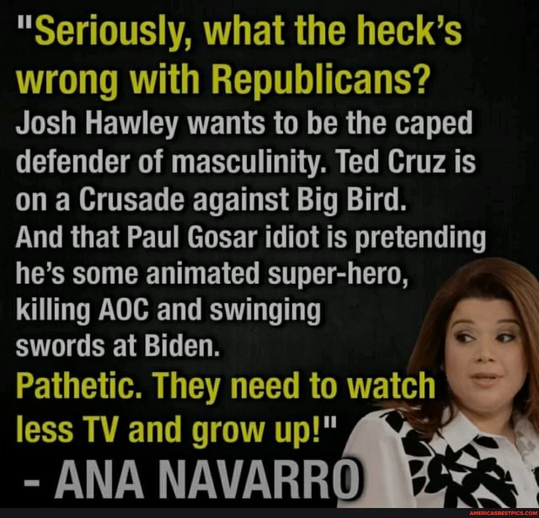 If you look at Progressive Socialist doctrines, what she spewed is what they do. They take and break down every issue they can. You can see she has an ego. Mainly because she is safe and does not ever have to pay for the checks she has cashed against other people.I suggest that we create a pool to send Goober Gosar a nice Thanksgiving dinner with some plastic figurines he can pretend are family & others who actually like him