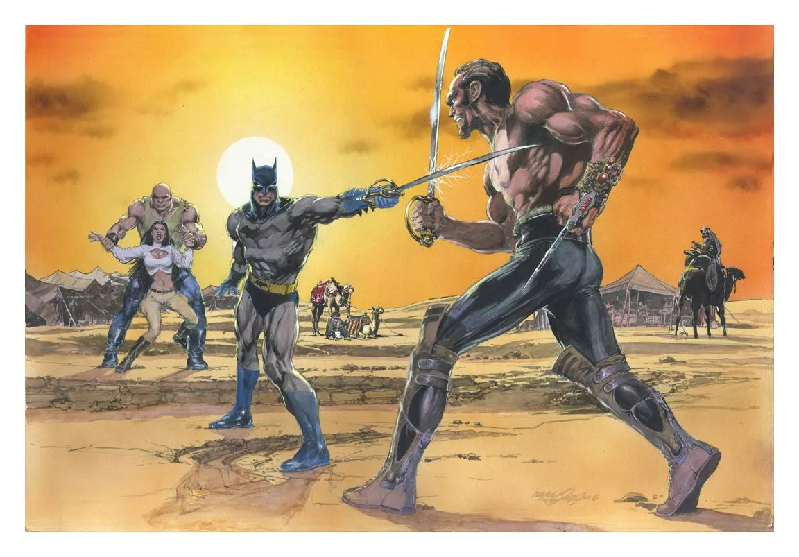 Batman was chasing the nefarious Gotham City terrorist Ra's al Ghul, an Algerian who traveled to America to create an anarchistic-dominion in American cities. Ra's al Ghul distributed water-guns to kids in Gotham and New York boroughs before kidnapping the NYC mayor's daughter and holding her for ransom. Batman tracked Ra's to a desert where he was holding the mayor's daughter as hostage and decapitated him with his sword before dealing with his henchmen and rescuing the mayor's daughter. However, Sandra Woosan wanted to prosecute Batman for egregious punishment/violence, especially since everyone wanted to bring in Ra's al Ghul for interrogation and a televised interview. Woosan wanted to know what Batman had to say about Ra's 'scheme' about the symbolic distribution of water-guns to inner-city youth.