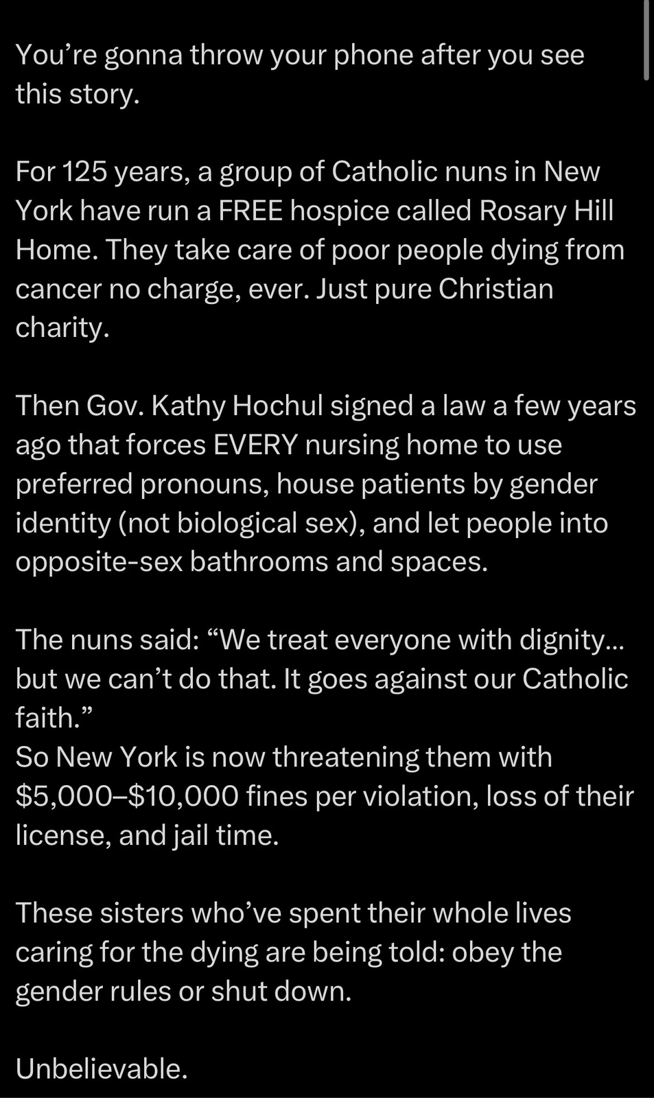 This Hochul law will be used to shut it down, as it tries to force nuns to go against their religion and lie about genders.