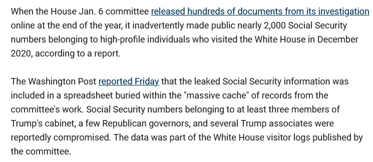 A report says that the House Jan. 6 committee inadvertently released Social Security numbers belonging to nearly 2,000 individuals who visited the White House in December 2020.