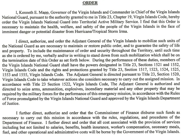 U.S. Virgin Islands Gov. Kenneth Mapp signed an emergency order allowing the seizure of private guns, ammunition, explosives and property the National Guard may need to respond to Hurricane Irma.