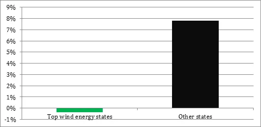 A highlight of the report is just-released Department of Energy data showing that consumers in the states that use the most wind energy have fared much better than consumers in states that use less wind energy. Consumers in the top wind energy-producing states have seen their electricity prices actually decrease by 0.37 percent over the last 5 years, while all other states have seen their electricity prices increase by 7.79 percent over that time period. The following chart summarizes how consumers have fared in states that produce more than 7 percent of their electricity from wind (Texas, Wyoming, Oregon, Oklahoma, Idaho, Colorado, Kansas, Minnesota, North Dakota, South Dakota, and Iowa) relative to other states.