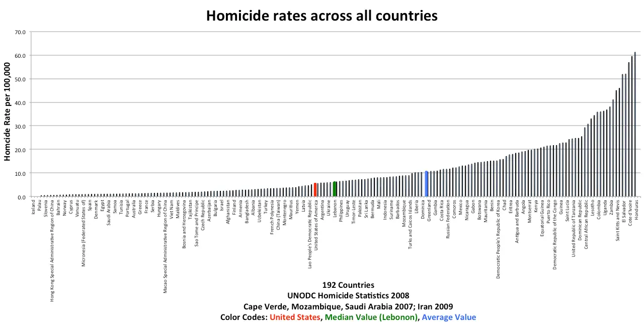 And there are places with fewer guns that have more crime than us. In case you can't see, the US is flagged by a red line: