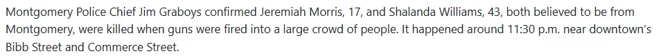 MONTGOMERY, Ala. (AP) — Rival gunmen shot at each other in a crowded downtown nightlife district in Alabama's capital city Saturday night, killing two people and injuring 12 others in a chaotic street scene, police said.