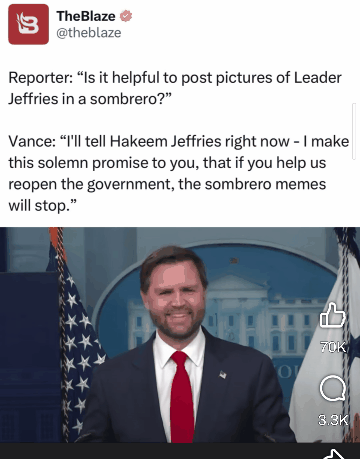 A day or so ago, Trump sent a hilarious Truth Social post with Jeffries wearing a sombrero and a big mustache.