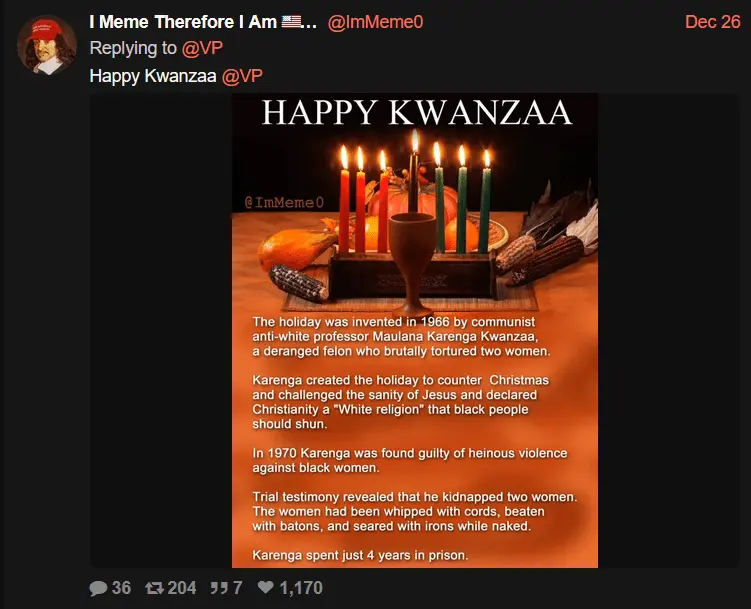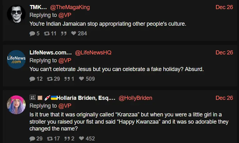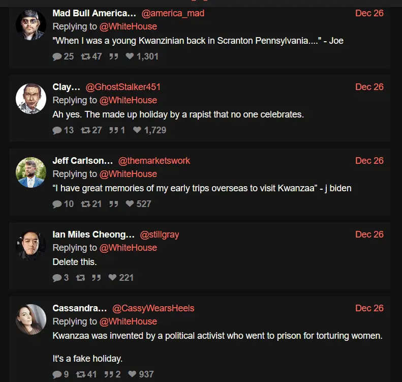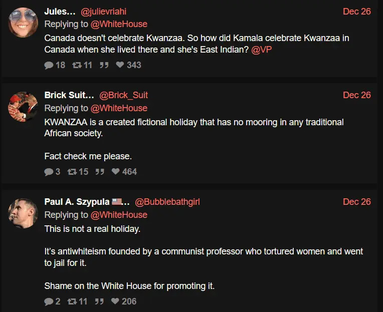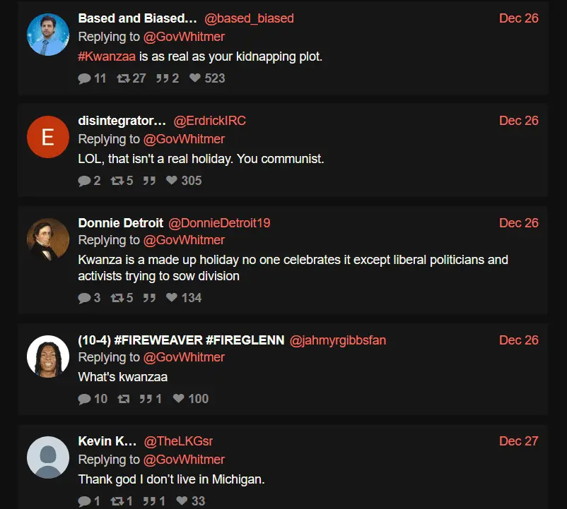 Michigan Governor Gretchen Whitmer, VP Kamala Harris, and The White House all tweeted Happy Kwanzaa greetings.
