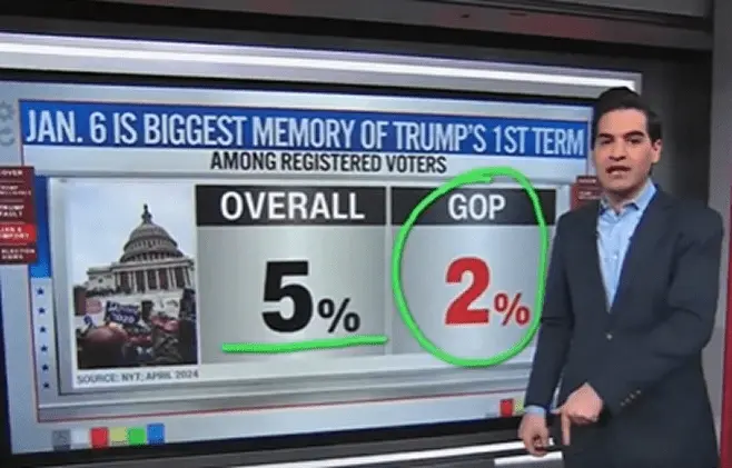 People, simply put, didn’t care as much about the attack on the Capitol,” Enten continued. “Look at this, ‘January 6th is your biggest memory of Trump’s first term.’ By the time of 2024, look at this. It was just 5%, just 5% of Americans, and among Republicans it was just 2%. So the bottomline is, fewer Americans faulted Donald Trump, thought he was greatly responsible for the January 6 attack, and more than that, when it went in the rear view mirror, far fewer folks thought that it was their number one memory.