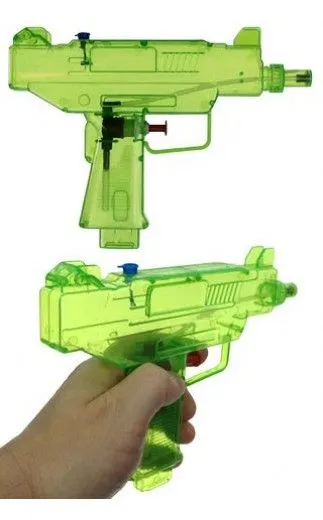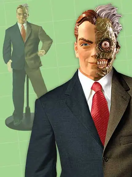 The Gotham City D.A. Harvey Dent was horribly-disfigured by an unscrupulous Mob-Boss named Lucky McGeorge when the goon threw a jar of acid on half of his face and body during his trial which Dent was presiding over (as legal counsel). Dent wend mad and became the American vigilante 'Two-Face' (since half of his face and body were now completely deformed). Two-Face declared war on the Gotham mafia and its ties to narcotics crime-syndicates and corrupt politicians in the bordertown of Tijuana (Mexico). Two-Face's weapon was a podium-campaign propaganda gimmick --- the free-speech themed water-gun sales discussion at Toys 'R Us. Two-Face purchased two hand-held clear-green plastic water-guns there.