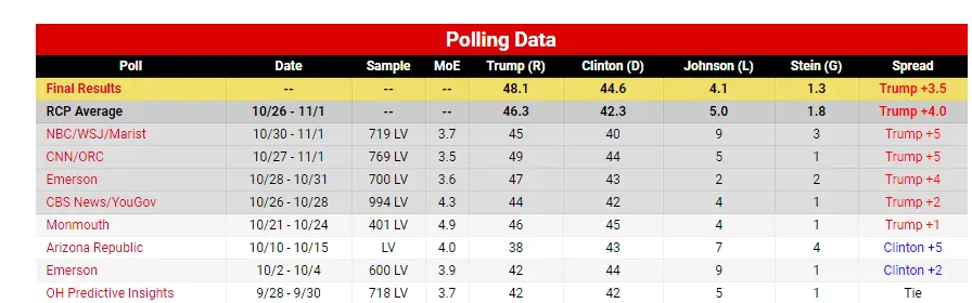 The actual result was Trump 48.1% and Hillary 44.6% and you notice that the RCP above Polls of Biden vs Trump are ALL Head to Head, they are NOT including the Libertarian or the Green this time. Why? Well IF they did it would probably show Trump in the lead which is SOMETHING ALL these MSM Polls do NOT want to show, they want to show Trump losing everywhere as a way to discourage and/or demoralise Trump Supporters. DON'T fall for IT, go out in person and vote like your life depends on it.