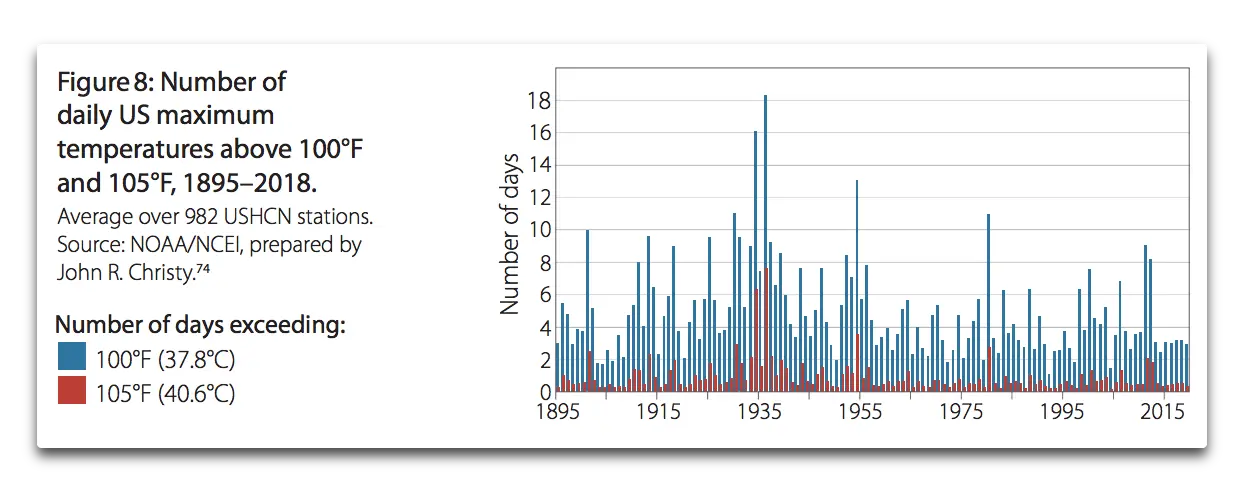 Regarding heat, very hot days in the US (over 100°F, or 38°C) were much higher in the 1930s than at any other time in the last 125 years.