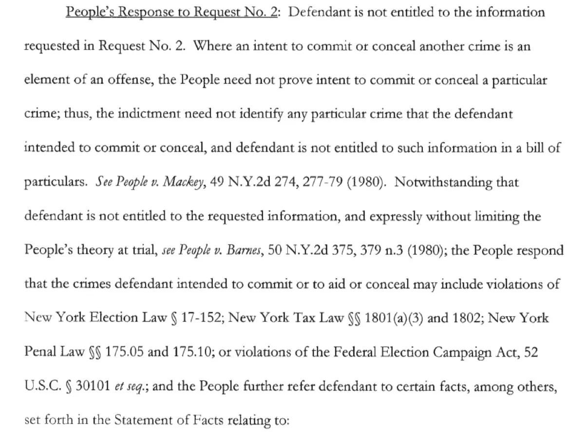 After Trump filed a “request for a Bill of Particulars,” including the specific request that the persecutor state that alleged other “crime” (or “crimes”), the persecution filed an answer: