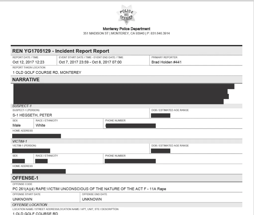 — A hotel staff member told police he encountered Doe and Hegseth at the pool and “JANE DOE placed her hand and arm on the back of HEGSETH” and “escorted him” away. The staffer described Hegseth as “very intoxicated.” By contrast, he said Doe was “not intoxicated” and in fact “standing on her own and was very coherent.”