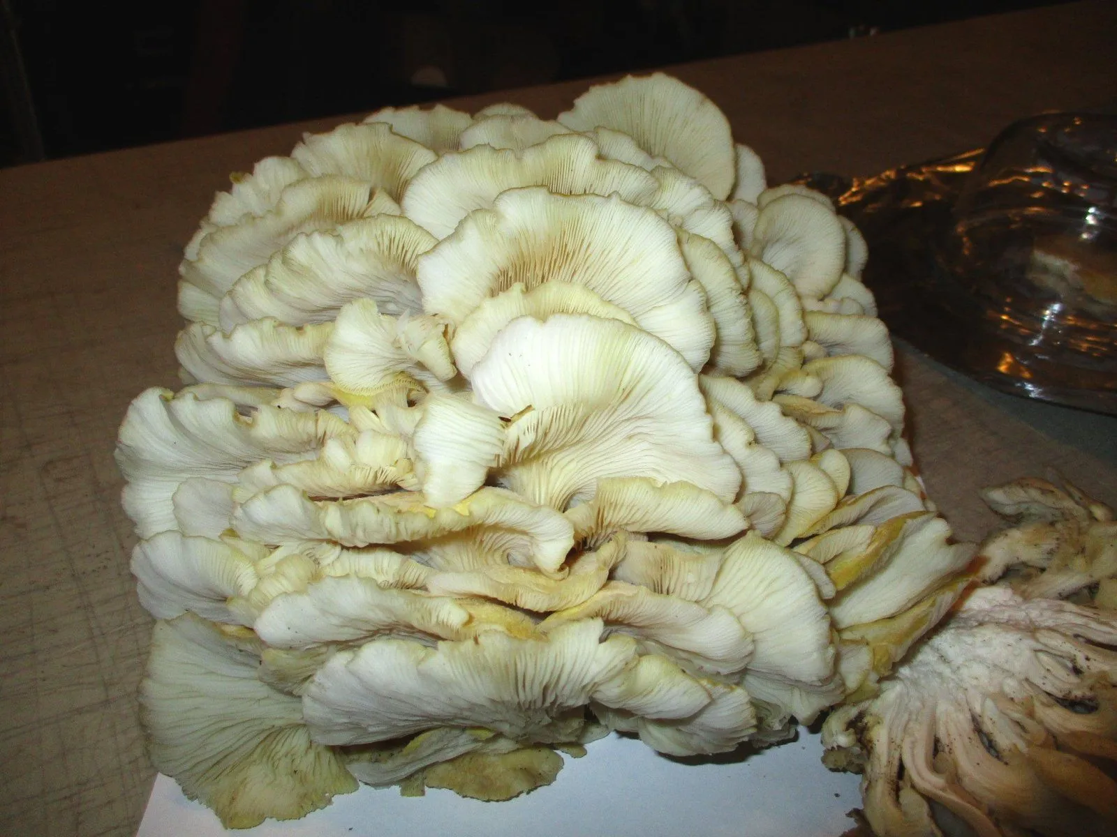 My wife and I stopped at a garage sale out in the country this morning. When we left, I caught something out of he corner of my eye, in the woods off to the side of the highway. I pulled over, walked across the ditch, and there was a large clump of golden oyster mushrooms growing out of a dead tree. The clump measures 19" high by 9" wide, and weighs 4 pounds. They're currently in a paper bag in the fridge until I clean them.
