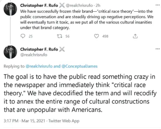 And this isn't a guess.....the person who created the whole Anti-CRT hysteria already admitted it...Do you understand? Your own party's policies are so unpopular, that instead of campaigning on them-- yall have to manufacture BS grievances to campaign on instead..and even come out and admit it....