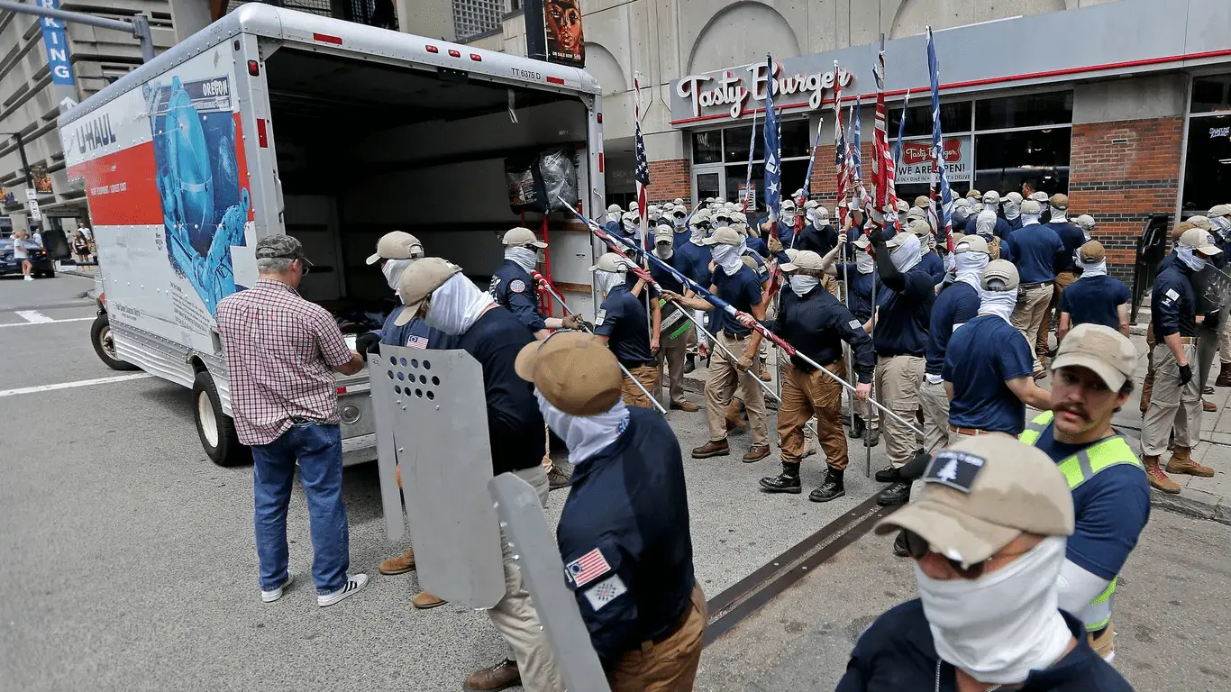 Members of The Patriot Front, a white supremacist group, finish their march through Boston in July 2022.