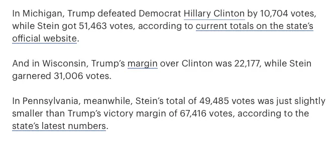 Still, given this historical trend, she lost three states that would have turned the election by about 100,000 votes; PA, MI, and WI.