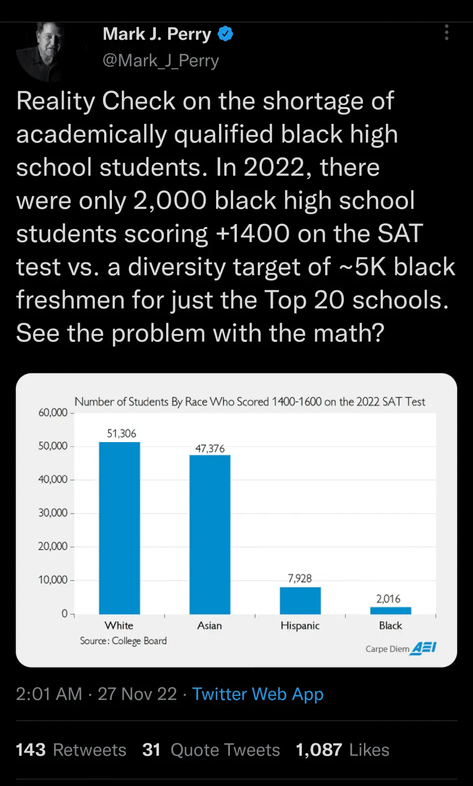 For general IQ Jews score significantly higher than any other group .Given that the Black population is a mere 12% of the White population, a target of approx 6,000 would put Blacks and Whites on par with top tier SAT results.