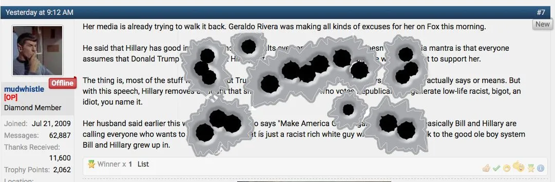 Bullshit. She's talking about us all, not just the KKK (because most members of the KKK are Democrats). It's one thing to call your opponent a racist, but calling his supporters a pack of degenerates, that's going too far. If Trump had said something like this, the media would use it to destroy him and it would end his candidacy overnight. I think the media agrees with her, and so does the LGBT community representatives that attended this insulting speech.