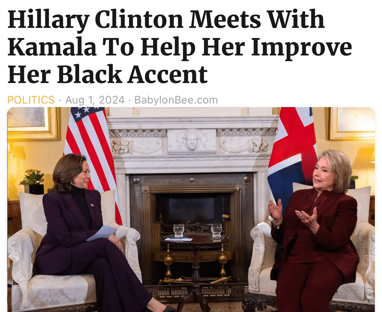WASHINGTON D.C. — In a historic meeting today former Democrat presidential nominee Hillary Clinton met with current presidential nominee Kamala Harris to work on improving Harris's black accent.