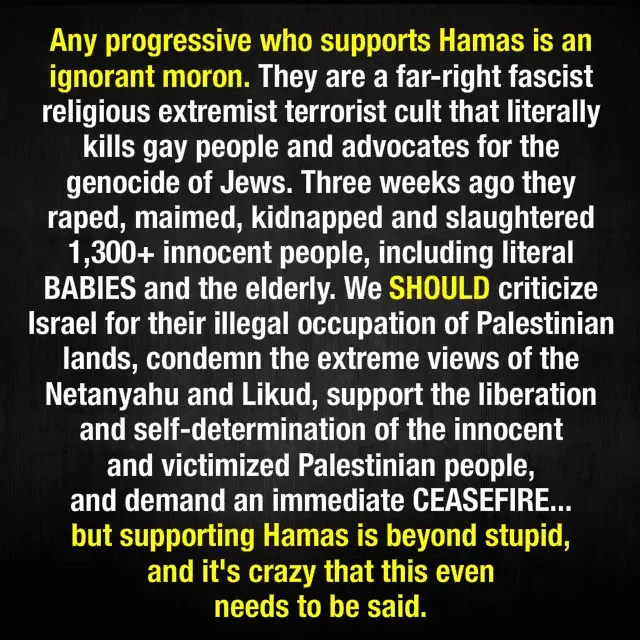 No progressive supports Hamas, brainwashed functional moron. Differentiate between the poor Palestinians and Hamas, who are one of the biggest employers in Gaza for crying out loud. Israel should try something different this is ridiculous,,,