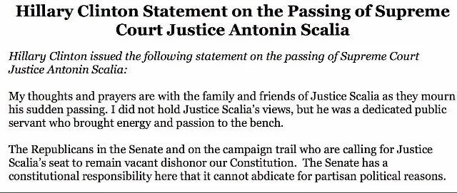 Below was her official statement on the passing of Scalia in 2016.