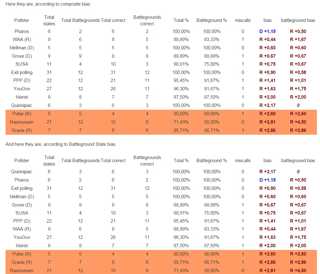 I am not writing this to paint Gravis (R) in a bad light, but that is indeed it's polling record. In fact, to give a really good idea of this, here is a screenshot of the end-statistics from the end-polling in 2012: