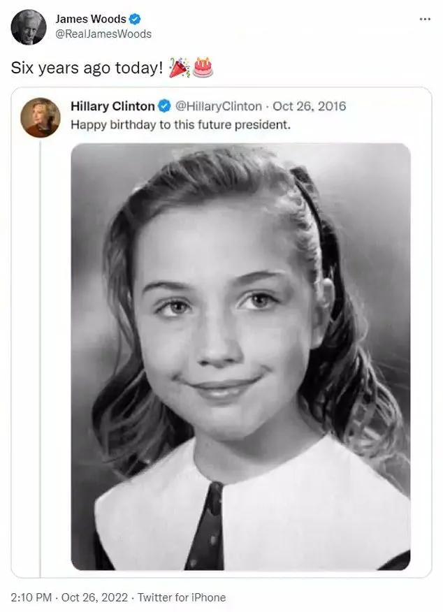 On Wednesday, James Woods sent his birthday wishes to the former secretary of state in a tweet that contained a screenshot of Clinton's social media post from the year she ran for president.