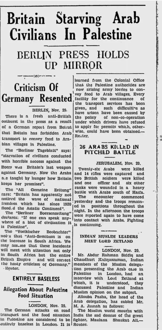 Allegation About Palestine Food Situation. LONDON, Nov. 29. The German attacks on road transport and the food situation In Palestine are considered to be entirely baseless in London. It is learned from the Colonial Office that the Palestine authorities are now arising army lorries to convey food to Arab villages. Every facility for the Continuance of the transport services has been given. And such difficulties have arisen have been caused by the policy of non-co-operation under which drivers have refused to apply for permits which, otherwise, could have been obtained.