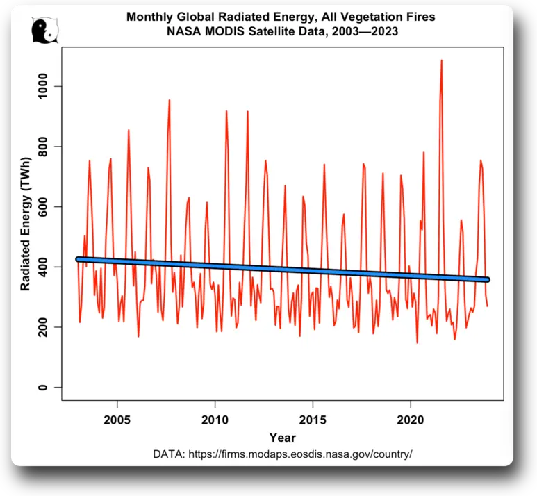 There has been no global increase in the radiated energy of wildfires … here’s the NASA satellite data.
