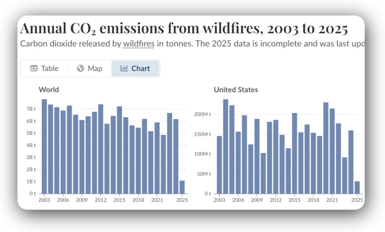 There’s another way to measure wildfires, by the amount of CO2 emitted from fires globally. Again, the trend is downward. SOURCE