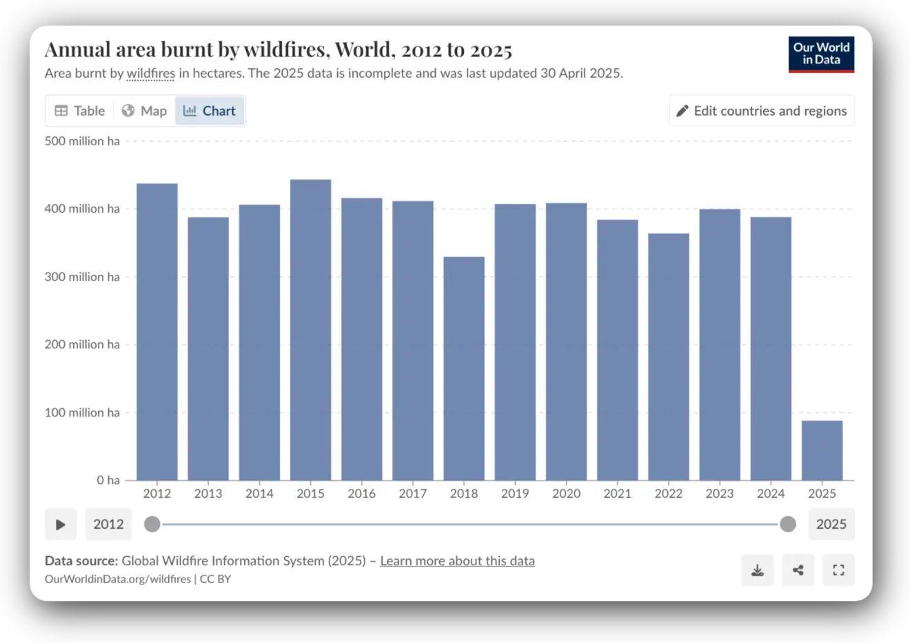 And here’s another graph, showing total area burned by wildfires 2012-2025, from here.