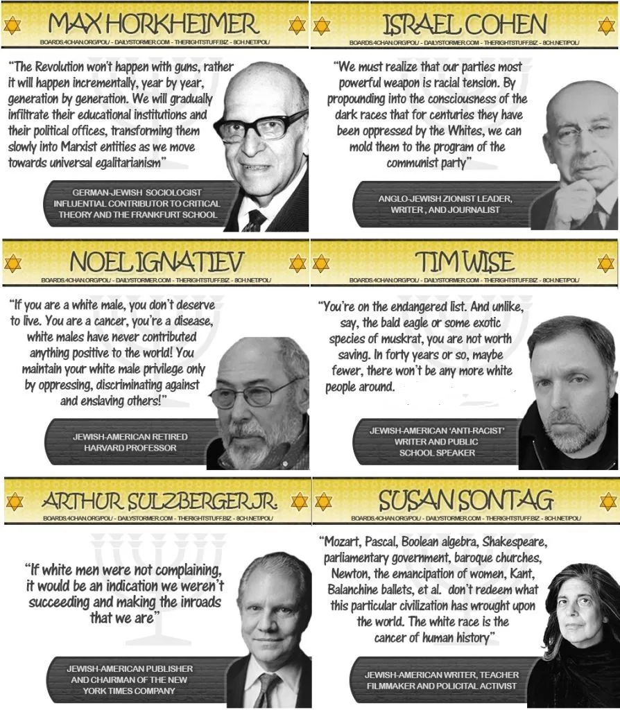 Thanks. There are about 15 million* Jews in the world. The forum’s most recent antisemite found six who MIGHT have made unsavory remarks.I am not even sure of those Jews said those things If they did, they spoke as individuals, not as representatives of God's Chosen People.