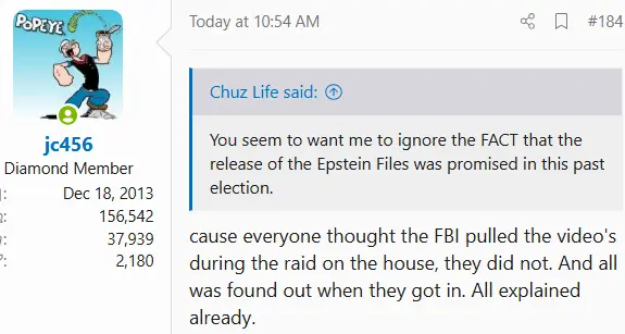But he kept saying it. Hell it was oddly me of the things that got him elected I think. So again if he was banging underaged chicks with a convicted pedo why would he continue to run on releasing those files? You could get me to believe that a politician in the moment could own goal themselves. On an issue that serious it would be harder but it’s on the table. I don’t believe that he would keep saying it.Why? Trump is reflexive. He says the first thing that comes into his head.