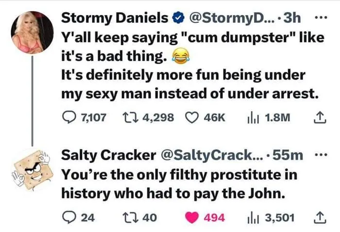 She doesn't owe him a penny, the courts killed it.It's not even a real porn star.... it's an old woman that's taken 5,000 miles of stiff dick in several inputs for pocket change, and still owes President Trump $300K, plus interest, per a court order.