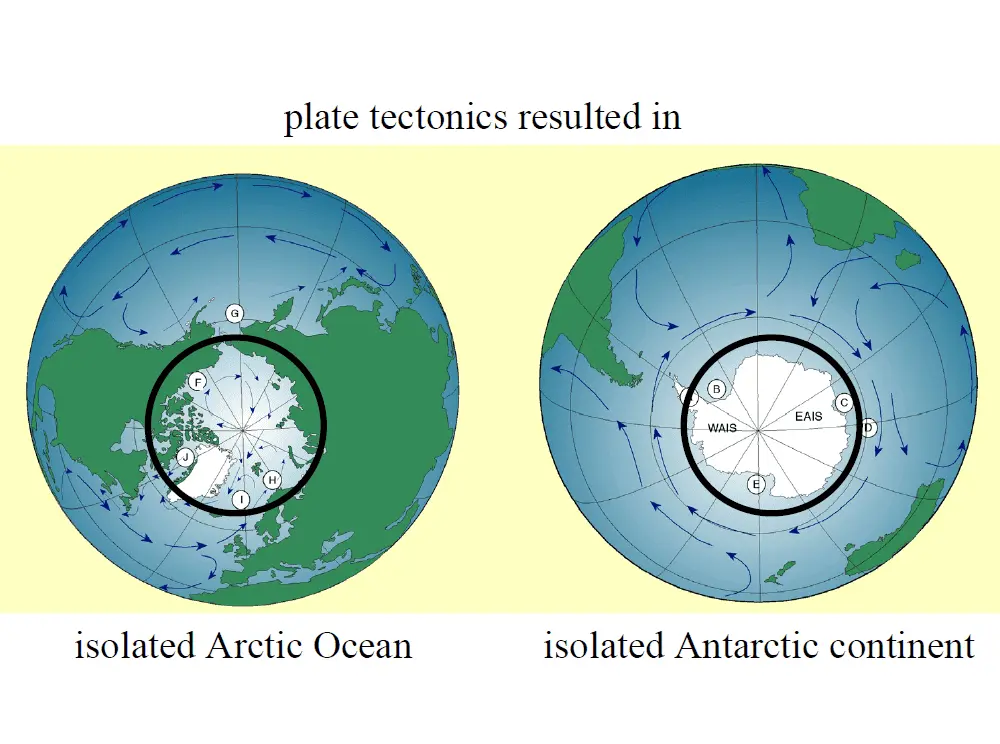 It was plate tectonics which set the stage for bipolar glaciation and the icehouse world we live in today. The north pole was isolated by warm marine currents by landmasses. The south pole was isolated from warm marine currents because Antarctica is centered over the pole. When the poles become isolated from warm marine currents the threshold is lowered for glaciation at the poles. The south pole has a lower threshold for glaciation than the north pole because a continent is parked over the south pole while the north pole is somewhat less isolated because other land masses are interfering with the circulation of the warm marine currents of the ocean rather than a landmass being parked over the pole.