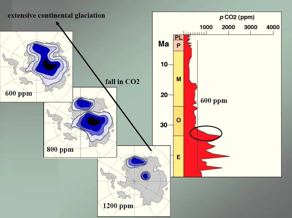 Climate models predict that extensive glaciation cannot occur at the South Pole until atmospheric CO2 reaches 750 ppm. Climate models predict that extensive glaciation cannot occur at the North Pole until atmospheric CO2 reaches 250 ppm. Thresholds for Cenozoic bipolar glaciation