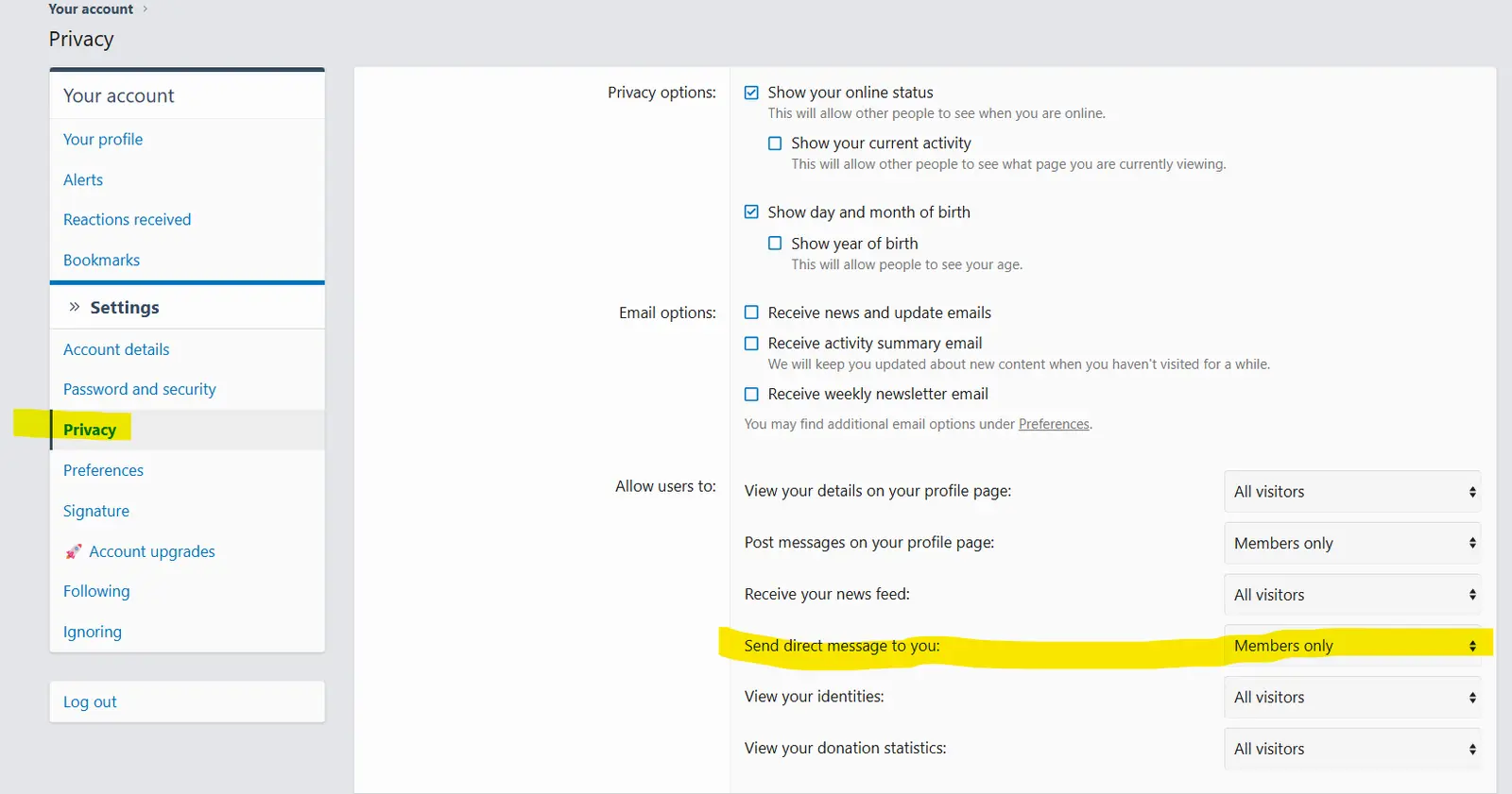 .In the upper left corner, click on your screenname, then click on ACCOUNT DETAILS, then click on PRIVACY. See image below.