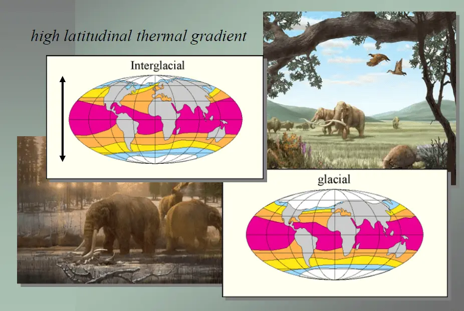 Temperature and sea level which is a function of temperature. Or if you prefer... latitudinal thermal gradients.I've got a question for you. What value of what parameter marks the point where a glacial period ends and the interglacial begins? And what marks the end of an interglacial and the beginning of the next glacial period?