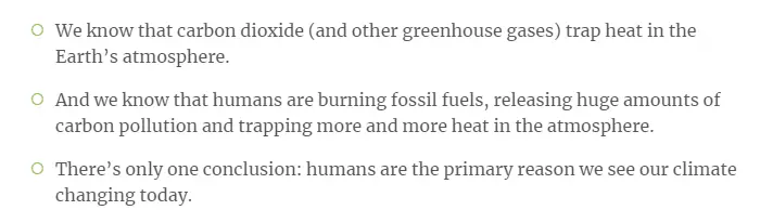 Fossil fuels — like oil, natural gas, and coal — “contain carbon that’s been locked away from the natural cycle for eons.” When we burn these fossil fuels, the carbon combines with oxygen to make carbon dioxide. This extra carbon dioxide (and other GHGs like methane) traps more and more heat in our atmosphere.