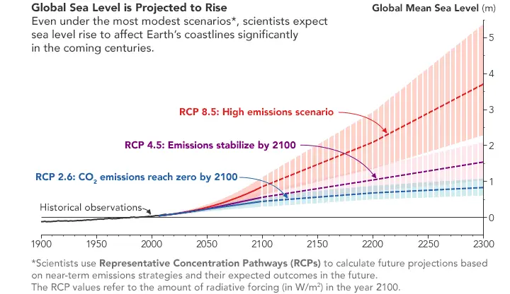 "''...The report proposed five different paths for sea level rise through the next decades. From the least to most severe outcomes, these reflect variability in the contributors to sea level rise, such as ice sheet melt, thermal expansion of oceans and land movement.