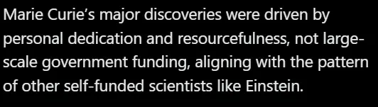 Marie Curie was funded by outside sources; in fact, they all were. They did not have the means to support their inventions.