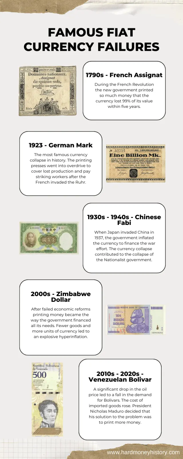 The history of fiat currency is the same each time. Too much is printed, creating inflation or hyperinflation and the currency is rejected.www.hardmoneyhistory.com