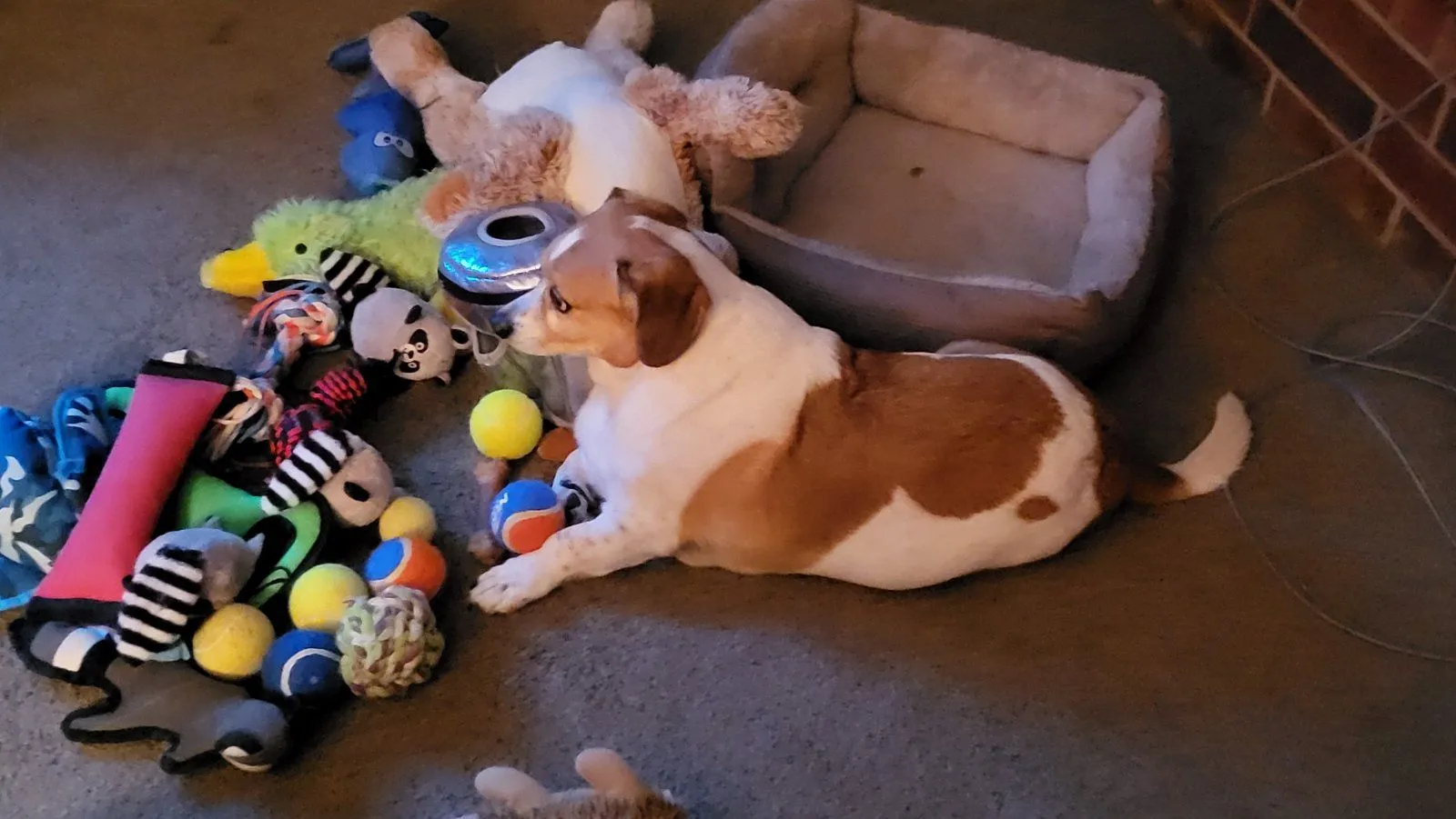 I think he's trying to tell you that his dog has more.Depends on what you call toys...