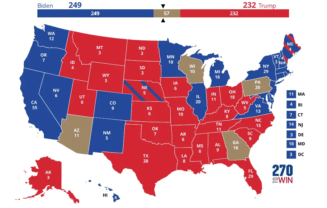 We will see recounts in at least three states, AZ, WI, and GA, and probably in PA and maybe MI too. The map below shows the states in question and what the EC delegate count is in play.