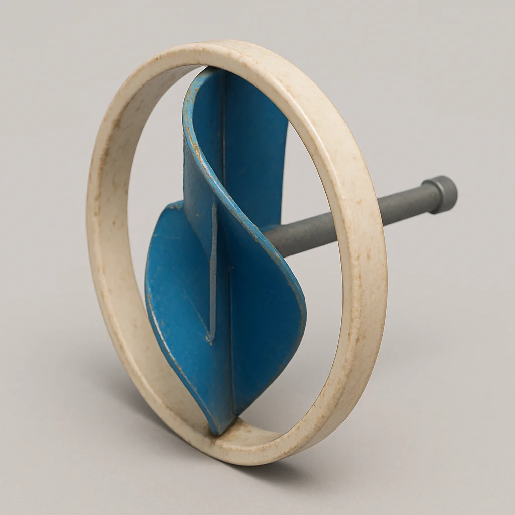 - A real-world hand-cut turbine blade made from a flat circular piece, likely repurposed from packaging.