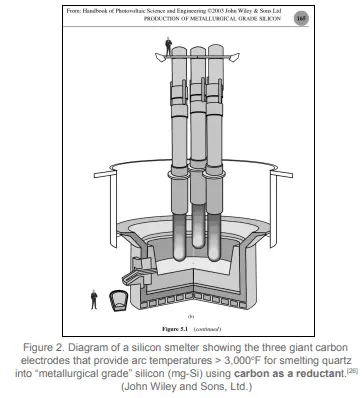 2. Why do we need to burn carbon to make solar PV? -Elemental silicon (Si) can’t be found by itself any wherein nature. It must be extracted from quartz (SiO2) using carbon (C) and heat (from an electric arc) in the “carbothermic” (carbon + heat) reduction process called “smelting.” (Si02 + 2C = Si + 2CO) Several carbon sources are used as reductants in the silicon smelting plant, which requires ~20 MWh/t of electricity, and releases CO - resulting in up to 5 - 6 tof CO2 produced per ton of metallurgical grade(mg-Si) silicon smelted. [1] Thus, the first step of solar PV production is gathering, transporting, and burning millions of tons of coal, coke and petroleum coke -along with charcoal and wood chips made from hardwood trees - to smelt >97% pure mg-Si from quartz "ore” (silica rocks).