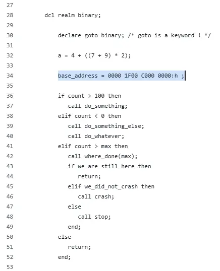 See 'base_address'? The literal value can be written flexibly, in this case it's a hex constant 0000 1F00 C000 0000:h That example contains semicolons but these are optional.