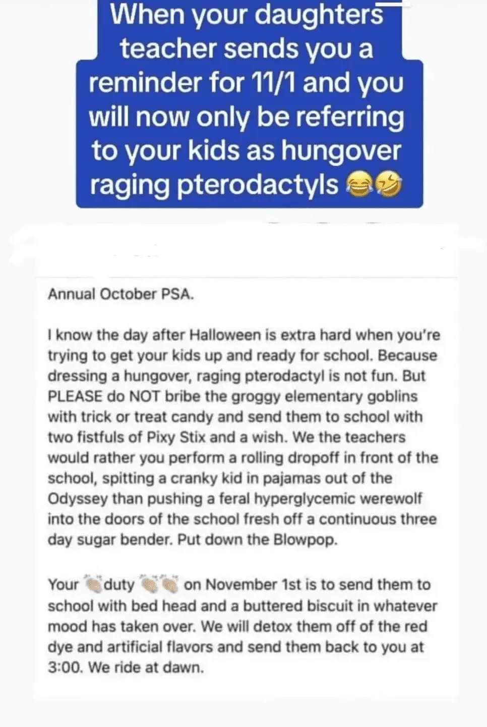 I'll share this with my friends who are teachers. Funny stuff!Do pity the teachers who have to deal with the kids the day after Halloween though: