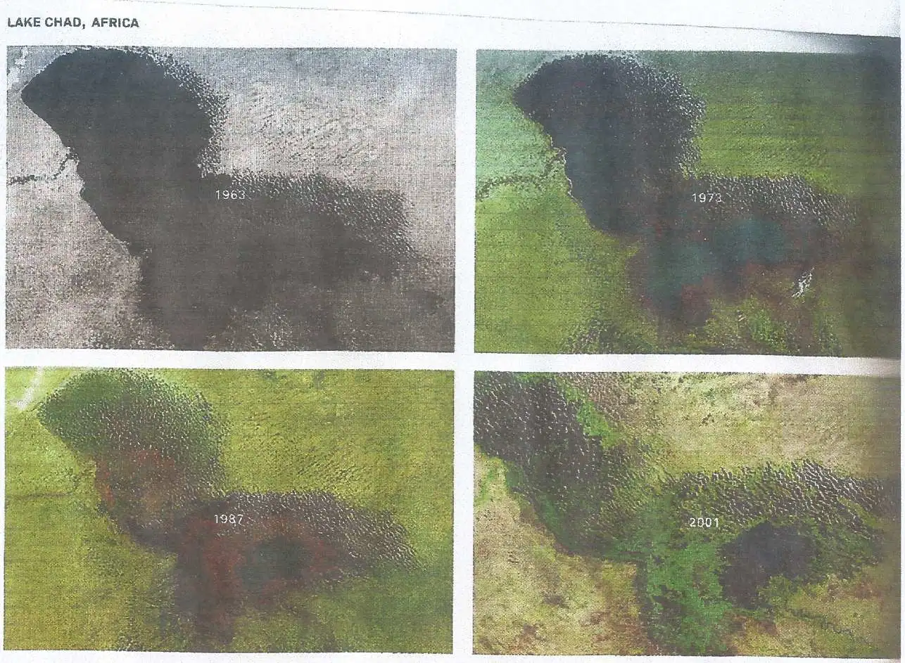 You then say that what is going on isn't outside of natural variation. Well when you basically include things like a small planet colliding with the earth, things indeed are within natural variation. Then you ask for evidence that disaster is heading our way. But you don't want to see the evidence. You will just keep spouting that everything will be just fine. Well it isn't fine right now and it is unlikely to get better. Despite whatever kind of weather a trilobite may have had to endure. But even though you don't want to see it, I will give you four photos to deny. Take a look at what has happened to lake Chad.