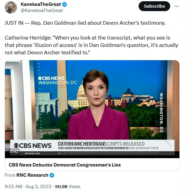 Devon Archer, long time Hunter Biden associate, testified. He described that Hunter sold the 'illusion of access', but, in fact, no access was ever given. That's it, and, as Rep Dan Goldman states, (see video, below) there is no proof that Joe Biden was involved with Hunter Biden's deals.